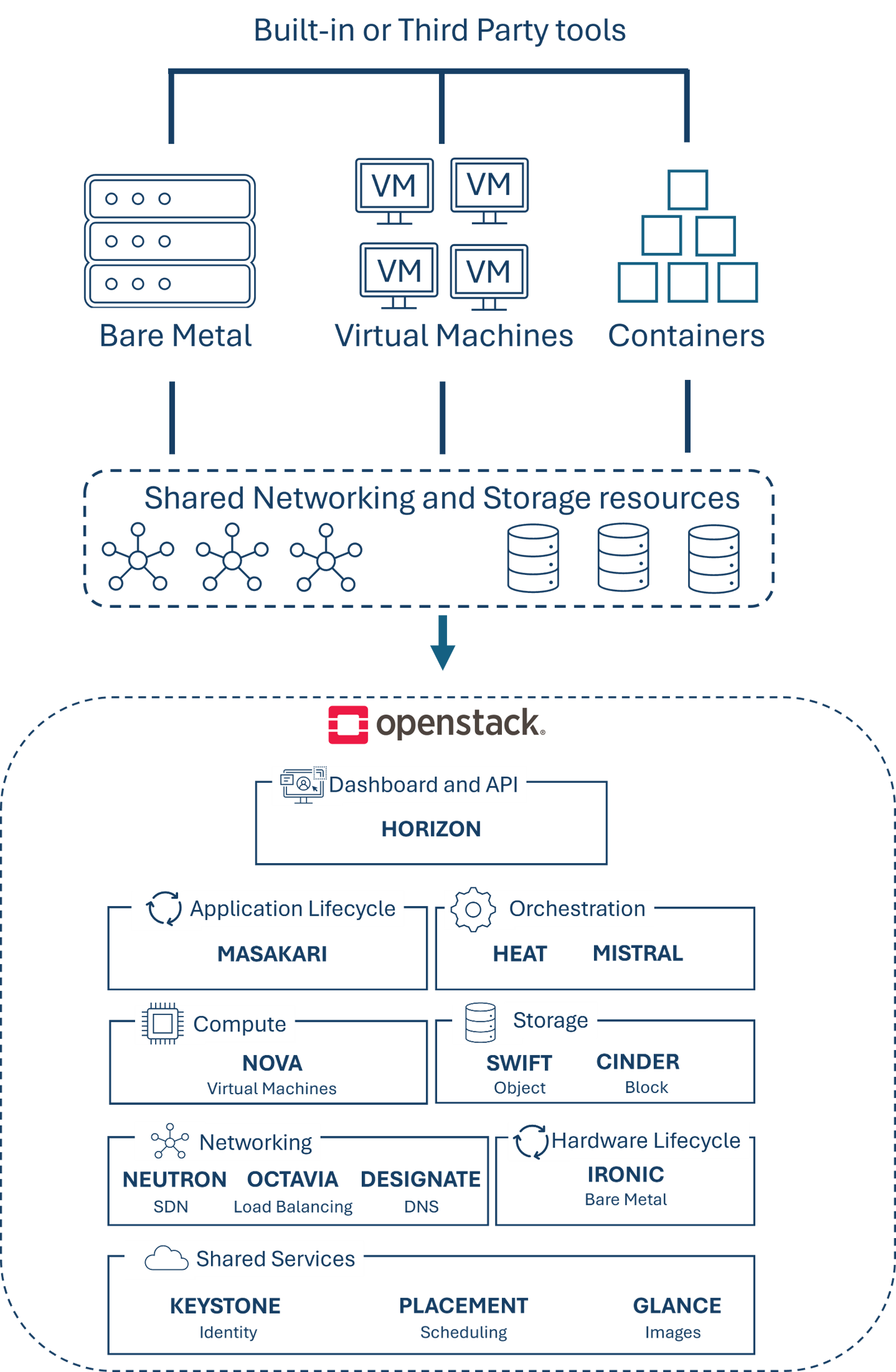 Fig. 4 Infrastructure as well as the OpenStack components that we use in our BlueBoxx-X3 solution¶