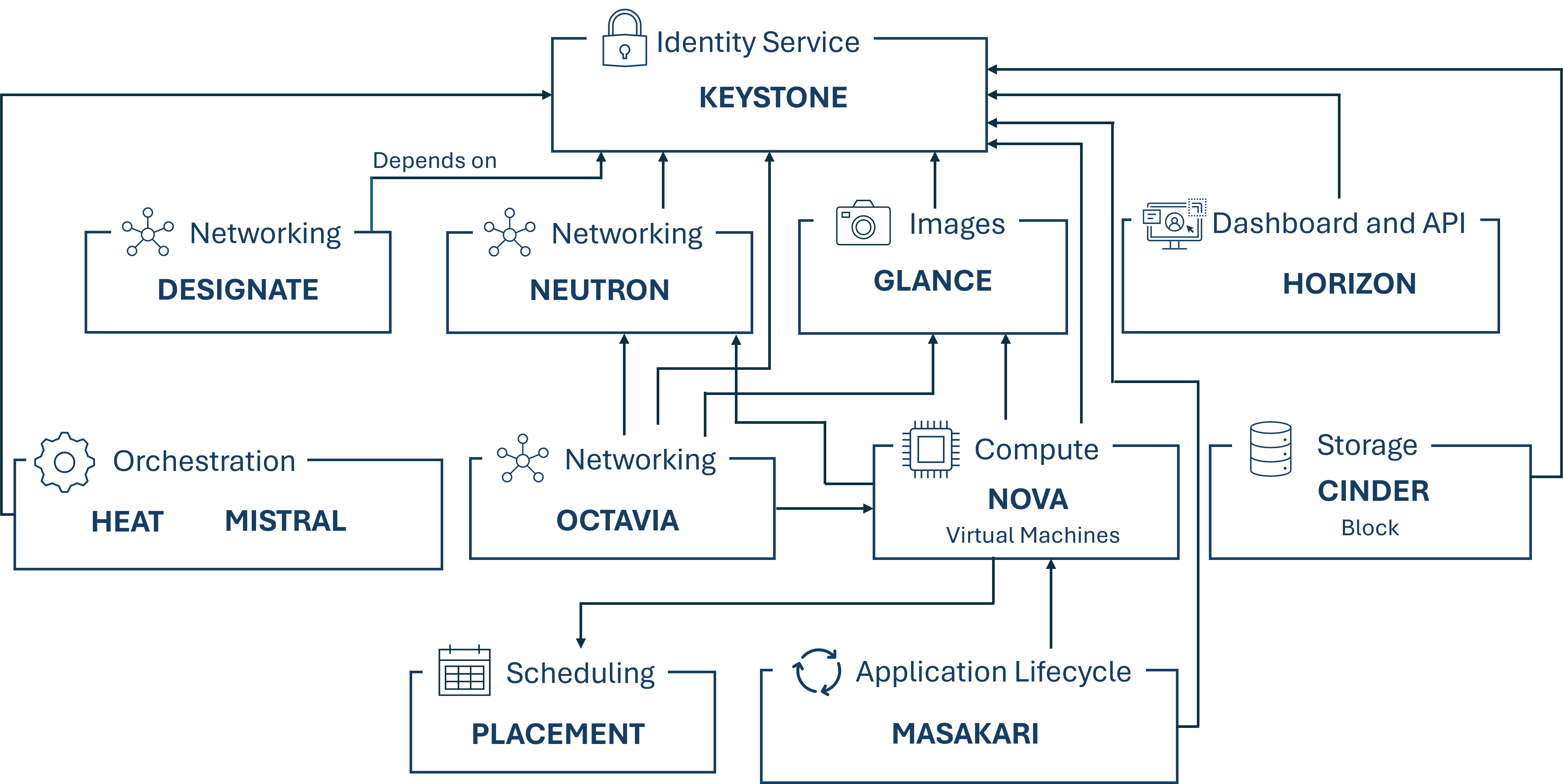 Heat: Heat is an OpenStack component for orchestrating infrastructure resources for cloud applications. This orchestration is achieved through templates in the form of text files, which can be treated like code. Such a template describes the infrastructure of a cloud application in a human-readable and writable format, allowing for management using version control tools. Since these templates describe the relationships between resources, this enables Heat to inform the OpenStack APIs of the correct order to create the planned infrastructure, so that the subsequent application can be started. With these templates, most types of OpenStack resources, such as instances, floating IPs, volumes, security groups, and users, can be created. Additionally, they also offer more advanced features like instance high availability, autoscaling of instances, and nested stacks. This autoscaling service allows for the integration of OpenStack Telemetry, thereby enabling the integration of scaling groups as a resource in a template. While Heat is primarily designed to manage infrastructure, the templates can be easily integrated with software configuration management tools like Ansible and Puppet. Heat provides both an OpenStack native REST API and a CloudFormation-compatible query API. Heat relies on the component “Keystone” for authentication and authorization.