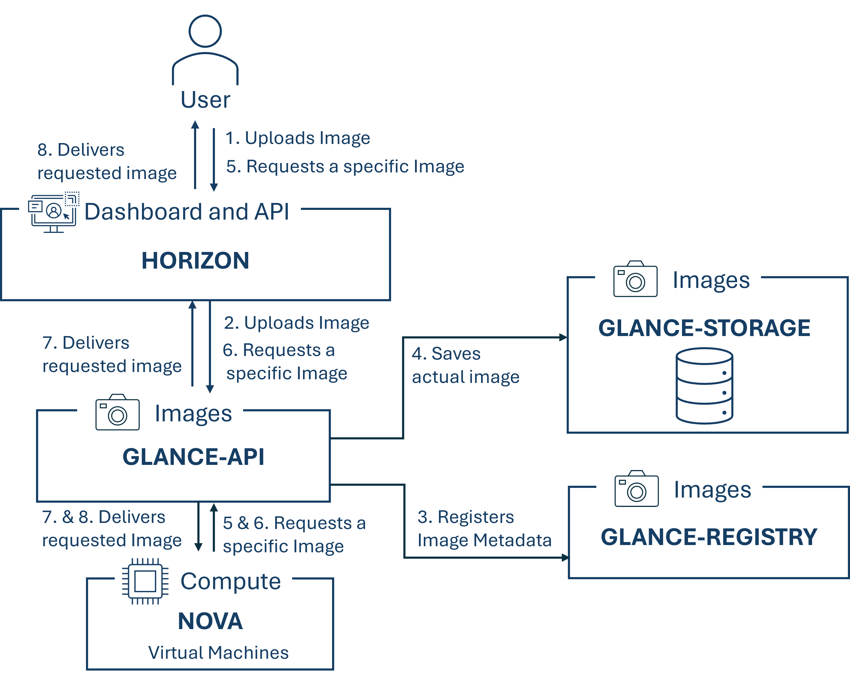 Glance: Glance is the OpenStack component responsible for discovering, registering, and retrieving virtual machine images. These images serve as templates for users to create new VM instances based on them. The actual image data is stored in various backends and made available to other OpenStack components for retrieval and use. Glance supports multiple image formats and allows metadata to be assigned to images, making them easier to find and manage. Through its provided RESTful API, virtual machine image metadata can be queried and the actual images can be retrieved. By centrally managing disk images and due to the easy access to pre-configured images, Glance enables fast provisioning of virtual machines. Standardization and consistency is offered due to the use of uniform images for specific tasks, and efficient resource utilization is provided through the ability to reuse or share images. The following diagram illustrates the process of adding an image to Glance and retrieving images from Glance, both from a user’s perspective using Horizon and from the perspective of another OpenStack component, in this case Nova.