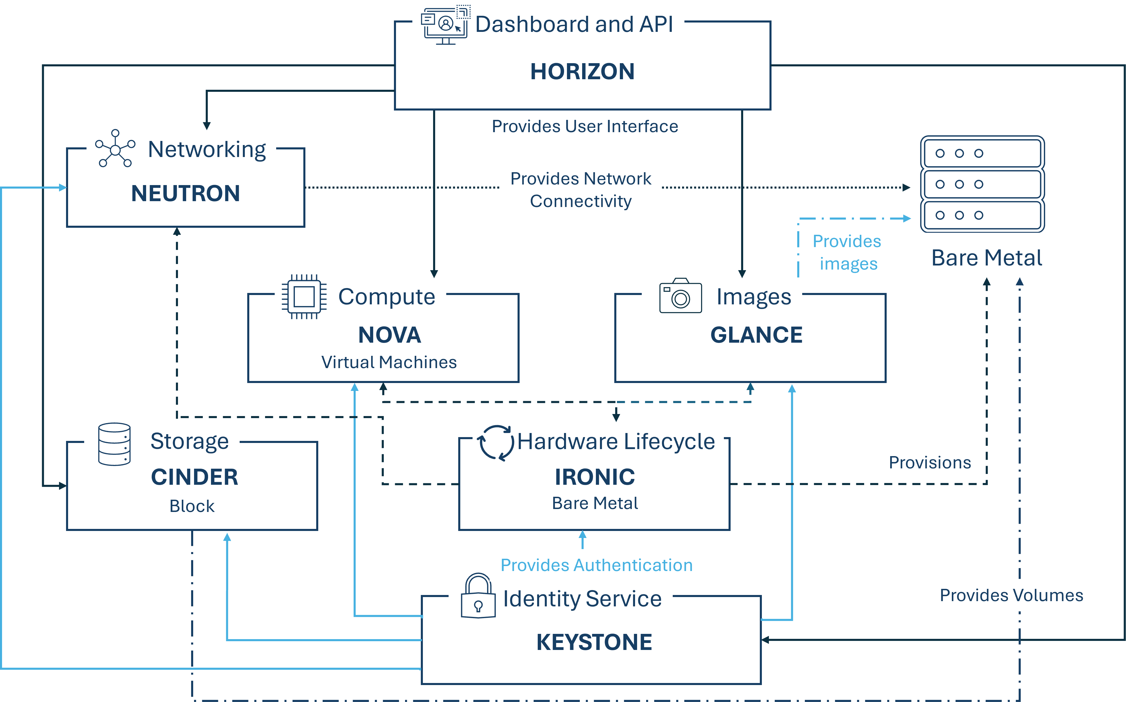 Ironic: Ironic is the component responsible for provisioning bare-metal machines. Integrations with Keystone, Nova, Neutron, Glance, and Swift are possible. Ironic allows managing hardware using standard protocols such as PXE and IPMI, as well as vendor-specific remote management protocols. It also provides for users a unified interface to the heterogeneous mass of servers, as well as an interface for the compute component Nova, allowing Nova to manage physical servers like virtual machines. Bare-metal servers are provisioned in the cloud for various purposes, some of the most important being high-performance computing clusters and tasks that require access to hardware devices that cannot be virtualized. Key technologies for bare-metal hosting include PXE, DHCP, NBP, TFTP, and IPMI. Preboot Execution Environment (PXE) allows a system’s BIOS and network interface card (NIC) to bootstrap a computer from the network instead of from disk. Bootstrapping is the process during which the system loads an operating system into local memory so that it can be executed by the processor. Dynamic Host Configuration Protocol (DHCP) dynamically distributes network configuration parameters, such as IP addresses for interfaces and services. When using PXE, the BIOS uses DHCP to obtain an IP address for the network interface so that it can find the server where the network boot program is stored. The Network Boot Program (NBP) corresponds to GRUB or LILO loaders typically used in local boots. Like a boot program in a hard drive environment, NBP is responsible for loading the operating system kernel into memory so that it can be bootstrapped over the network. Trivial File Transfer Protocol (TFTP) is a simple file transfer protocol typically used for automated transfers of configuration or boot files between machines in a local environment. However, when PXE is used, it serves to download the NBP over the network using the information obtained from the DHCP server. Intelligent Platform Management Interface (IPMI) is a standardized computer system interface used by system administrators to monitor their system and for handling the out-of-band management of their systems. This means that, due to a network connection being established directly with the hardware rather than just with the operating system, systems that do not respond or shut down can still be managed through IPMI. The following figure shows how Ironic interacts with other OpenStack components when Ironic is used.