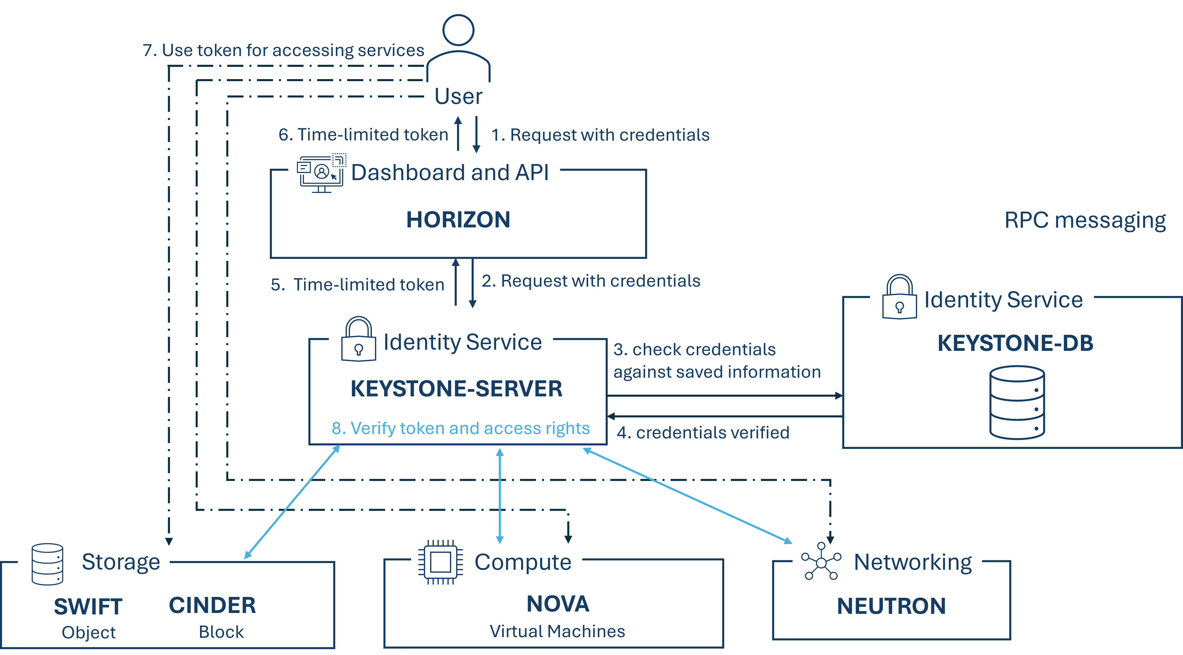 Keystone: Keystone provides an API client authentication, service discovery, multi-tenant authorization, and identity management. Its primary functions are the management of users, domains and projects, also known as tenants, as well as authenticating users and services before granting them access to cloud resources. Additionally, it includes access control, which allows to enable or deny accesses based on roles and permissions. This component serves as the entry point for users and applications that want to access OpenStack resources or services. How a such login via Keystone for accessing a resource works, is illustrated in the following figure.