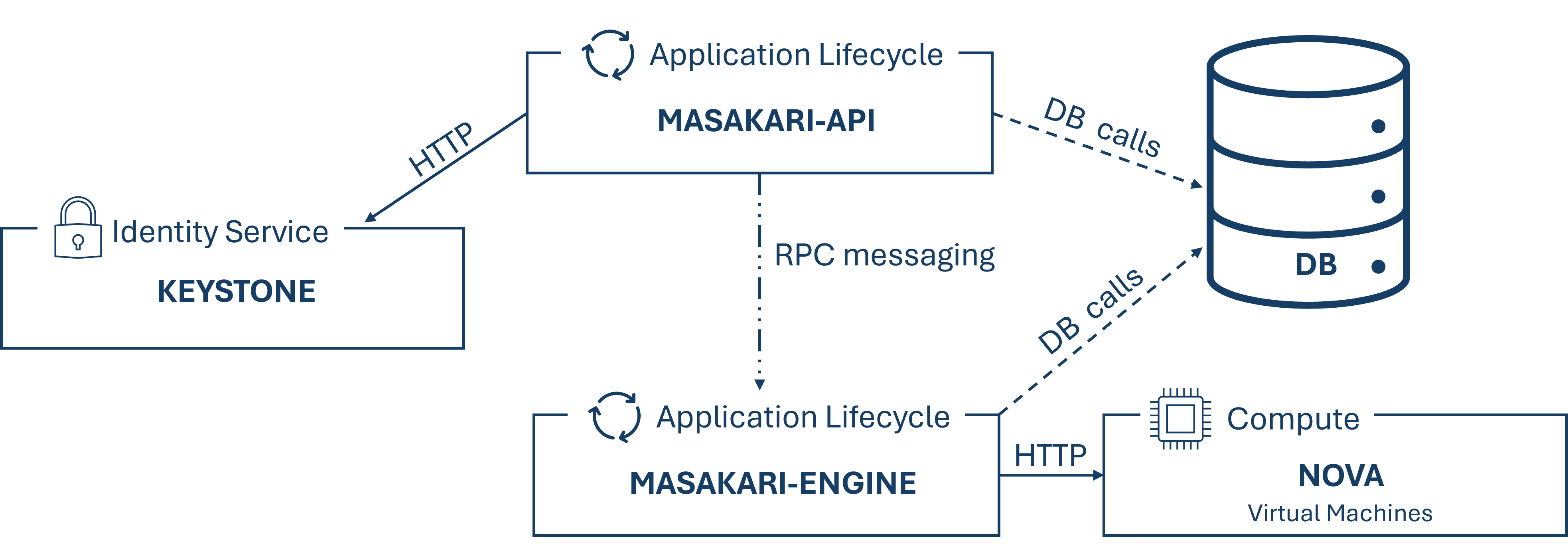 Masakari: Masakari offers an instance high availability service for OpenStack clouds by automatically restarting failed instances or compute processes. To manage and control this automated recovery mechanism, Masakari also provides an API service. It can automatically restart KVM-based virtual machines from failures such as virtual machine process down, provisioning process down, or nova-compute host failure. Masakari consists of two services: an API and an engine, which perform different functions. The API server processes REST requests, typically involving database read/write calls, converts the commands, sends RPC messages to the engine, and generates responses to the REST requests. The engine runs on the same host as the API and has a manager that reacts to RPC messages and performs periodic tasks. Additionally, the engine executes the recovery workflow and communicates with Nova via HTTP. Masakari relies on the OpenStack components “Keystone” and “Nova”. The communication architecture of these key components is depicted in the following figure.