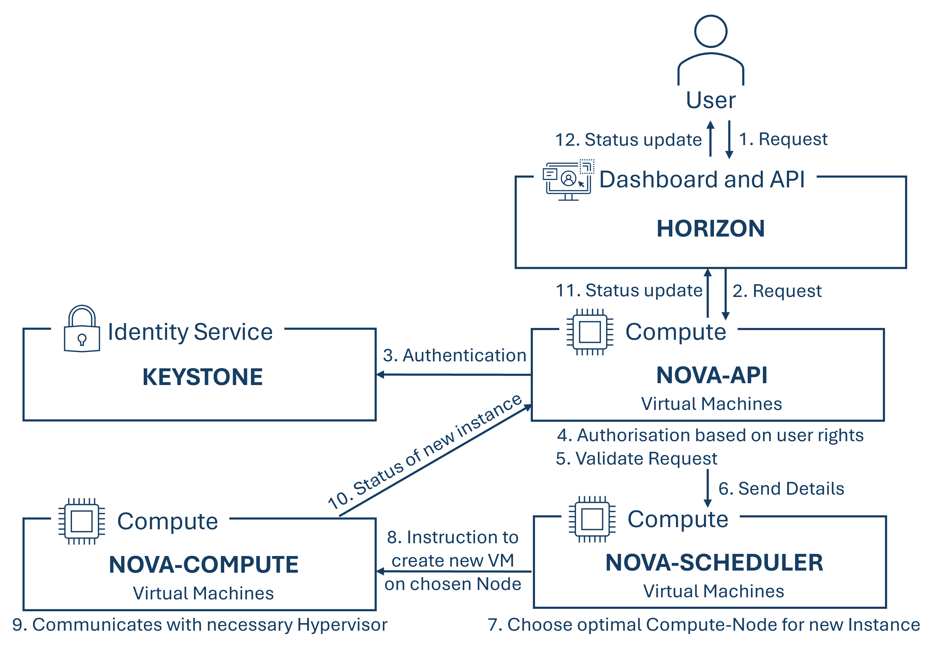 Nova: Nova is a service used for provisioning compute instances. It supports creating virtual machines and in collaboration with Ironic also creating bare metal servers. It also has limited support for system containers and provides these resources through a self-service platform. Nova is modularly designed to ensure scalability, flexibility, and maintainability. The support Nova offers for various hypervisors, therefore covering a wide range of virtualization technologies contributes to this flexibility. One of the supported hypervisors is VMwareESX, which belongs to the VMware product family, enabling access to advanced features such as vMotion, high availability, and dynamic resource allocation (DRS) for virtual machines. Nova can communicate with the vCenter server, the VMware ESX API, which manages one or more ESX host clusters. These clusters are presented to Nova as a single large hypervisor entity. The actual selection of an ESX host within these clusters is performed by vCenter using DRS. It is recommended to run one Nova Compute service per ESX cluster. Furthermore, the hypervisors are interchangeable as long as a corresponding driver is available, thanks to communication through an API. Nova consists of the API, Scheduler, Compute, and Conductor modules. While the API module receives and processes API requests from users and other OpenStack services, also handling authentication through integration with Keystone for access management and security, the Scheduler module decides on the optimal distribution of workload across available resources based on available resources and filter criteria, by deciding on which compute node a new virtual instance should be started on. The Compute module manages virtual machines on compute nodes by starting, stopping, modifying, or deleting them. It also provides hypervisor support for various hypervisors like Hyper-V, VMware, Xen, or KVM. The last module, the Conductor module offers a trusted environment for sensitive operations that should not be performed directly on the compute nodes for security reasons. It can also take over tasks from other Nova components to reduce their load. The interaction between these modules when creating an instance is explained in the following figure: