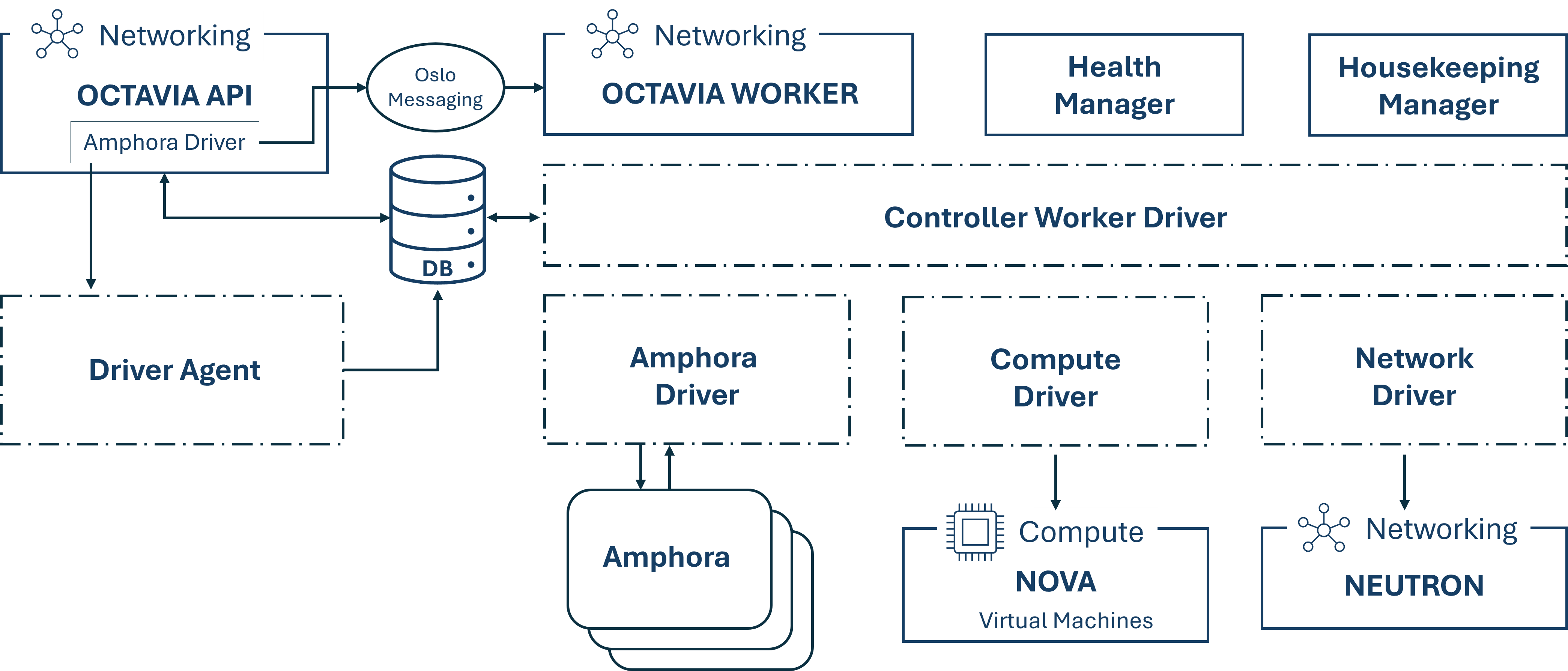 Octavia: Octavia is the load-balancing component of OpenStack. By scaling its fleet of virtual machines, containers, and bare metal servers, also known as amphorae, on demand to handle load distribution tasks, this horizontal scaling function differentiates Octavia from other load balancing solutions and makes it truly suitable for cloud environments. Octavia is responsible for distributing incoming network traffic across multiple servers to ensure high availability and optimal resource utilization. Multiple drivers are supported, and Octavia can be integrated with Neutron. To be able perform its tasks, Octavia uses several OpenStack components: