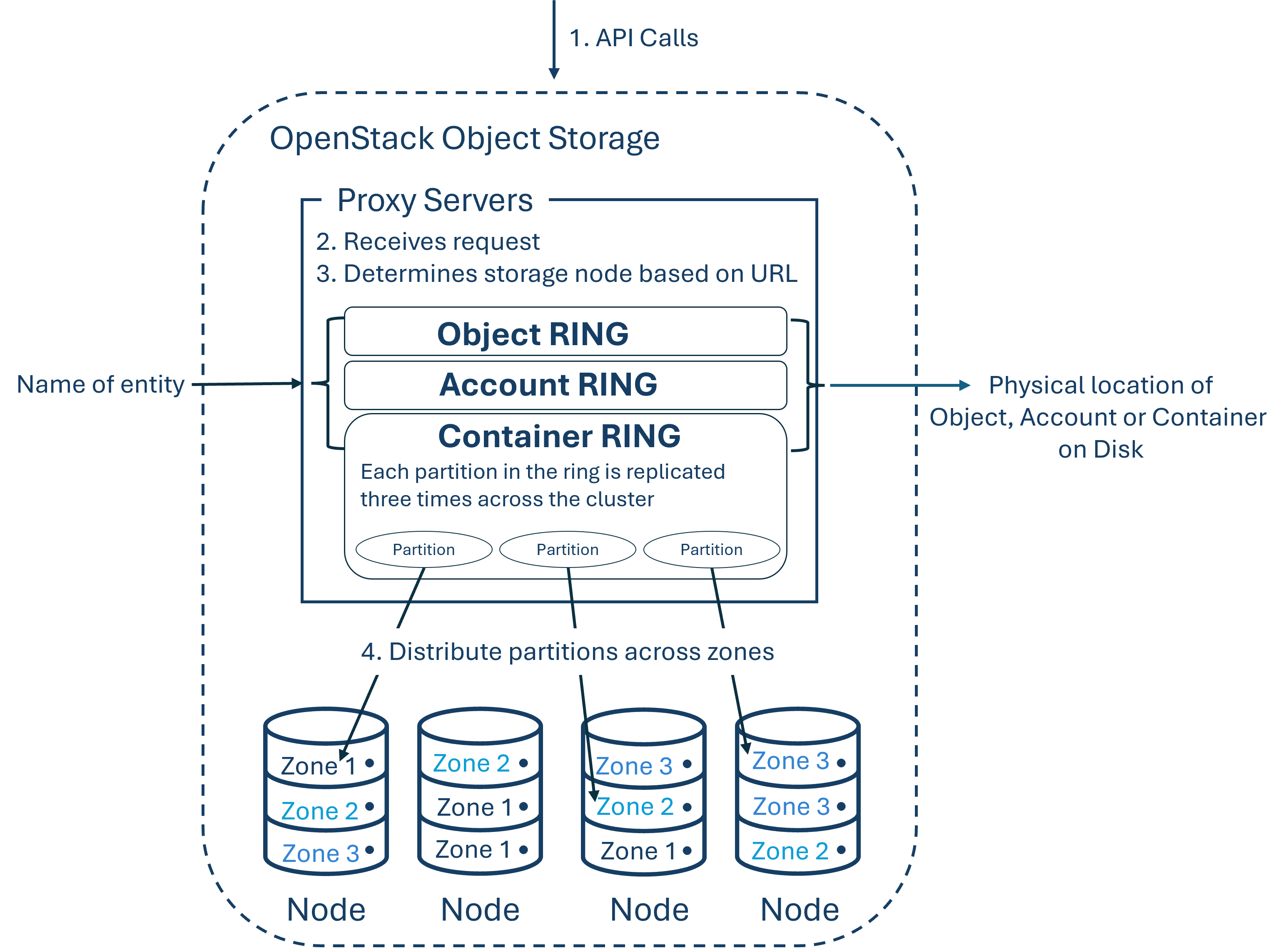 An object store consists of multiple components to provide high availability, durability, and concurrency. Proxy servers handle incoming API requests, rings map the logical names of data and their storage location on a specific disk, zones isolate data from different zones from each other, ensuring that an error in one zone does not affect the rest of the cluster, due to the data being distributly replicated over several zones and objects are the actual data itself. Weiters gibt es Accounts und Containers. Additionally, there are accounts and containers. Each is a separate database distributed across the cluster. While the account databases contain a list of all containers belonging to the account, a container database keeps track of all objects within this container. Partitions store objects, account databases, and container databases and help manage the storage spaces where these data are stored at the cluster. These components and their interactions are illustrated in the following figure: