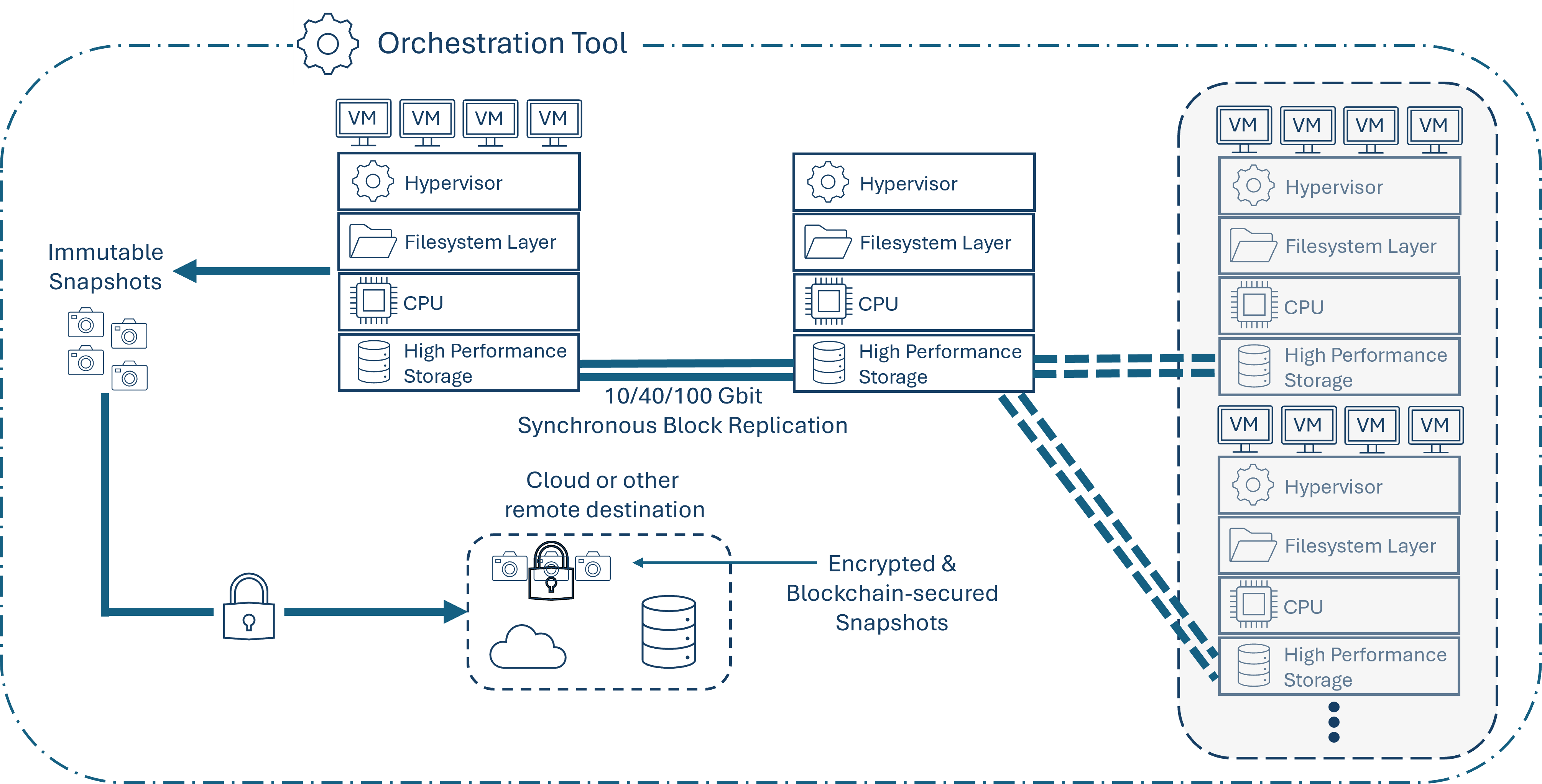 Near Zero Data Loss Backups: This is ensured through atomic snapshots of the entire environment and immutable data protection. Traditional backups are thus only necessary in exceptional cases anymore. Also regular restore tests and daily operational handling are no longer required due to BlueBoxx. Snapshot mechanisms below the virtualization layer, which allow for near-realtime distribution to any number of remote sites, are one of the reasons for the elimination of these extra efforts. Without additional costs or effort, this results in a recovery point objective which is only in the minute range while the recovery time objective is even in the range of seconds. Moreover, snapshots themselves are immutable and secure against changes and man-in-the-middle attacks. Additional encryption also allows storing them in public cloud environments.