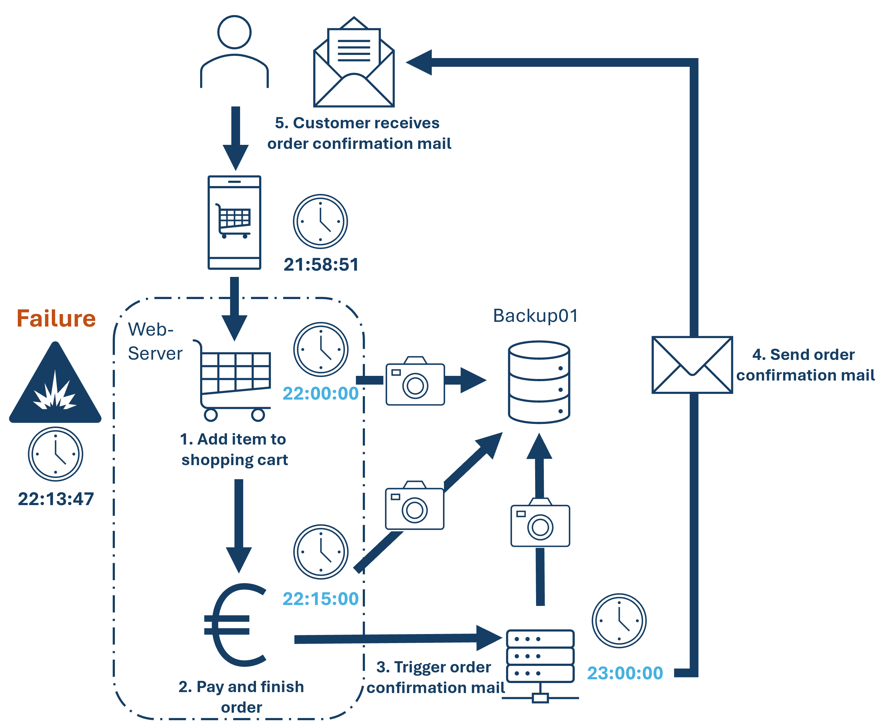 This leads to the following scenario: if a transaction is taking place exactly in the timeframe between different backups and the webserver crashes within this timeframe as well due to a natural disaster, a power outage or due to other reasons, backups of all systems will exist, however they will not have the same state. In this case, for example, an item has been purchased via the webshop, the customer has already paid for the item and has received a confirmation mail. However, by only looking at the backups one could not figure out this scenario, due to the webserver having crashed within the timeframe between backups. In this case the server crashed after a backup has been made of the items that have been added to the shopping cart, but before a backup has been made of the transaction finishing the order process and also before the mailserver has started its backup.