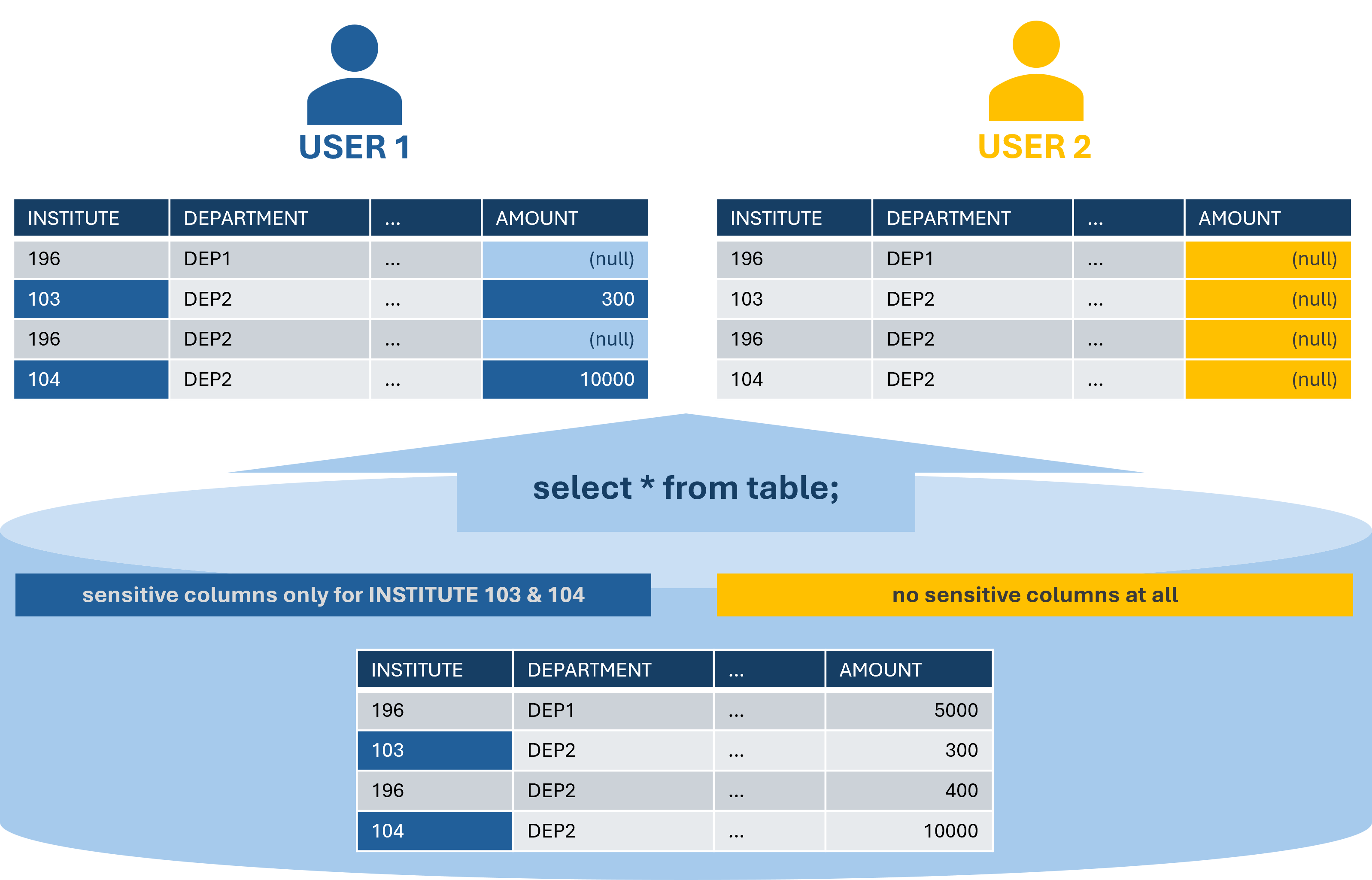 An example for column level security can be seen in Figure 5.7. Here the access to sensitive columns, in this case the column ‘AMOUNT’, is limited according to the ‘INSTITUTE’ column values and the user.