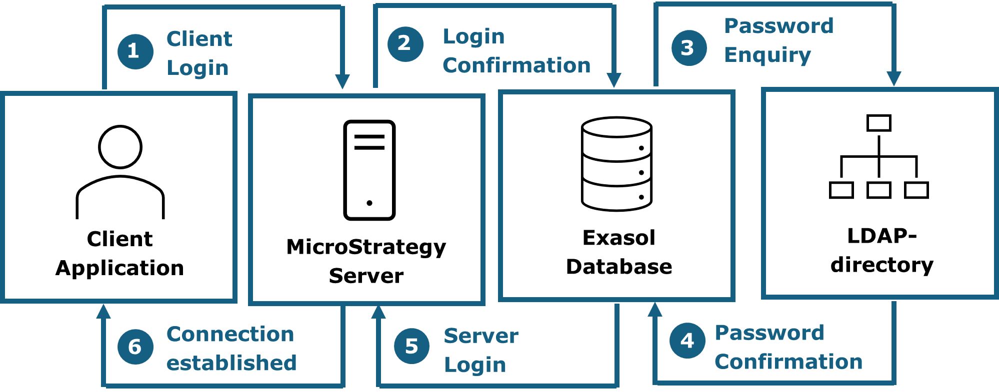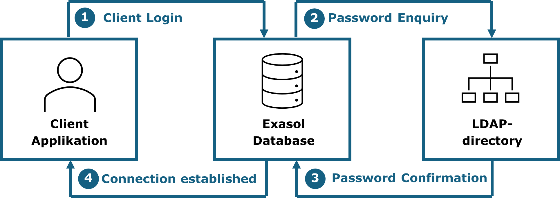 In 2-tier environments the authentication happens directly from the client application to the Exasol database. If a LDAP-directory is configured, the password will be queried from there.