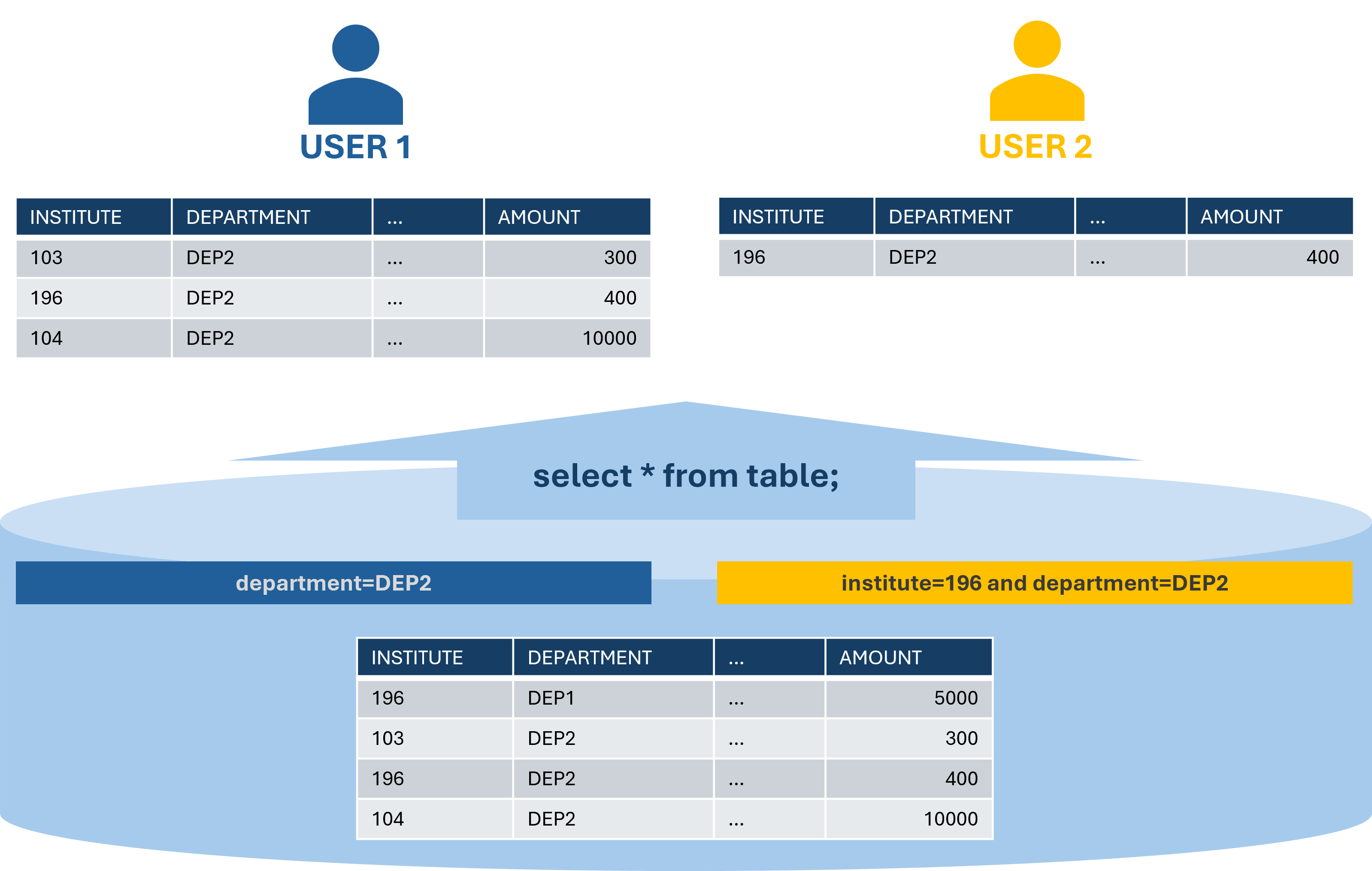 An example for row level security can be seen in Figure 5.6. Here the access to rows is limited according to the DEPARTMENT column values as well as the INSTITUTE column values.